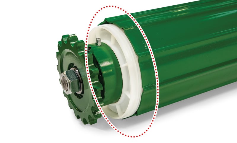 Walzen mit einfachen Kettenrädern laufen antriebsseitig auf 50mm großen Wellen und Lagern. Walzen mit hoher Last lagern auf doppelreihigen Pendelrollenlagern. Alle Walzen, die mit doppelten Kettenrädern bestückt sind, drehen mit 55 mm Wellen auf 55 mm großen Lagern. Die andere Seite der Ballenkammer dreht ebenfalls auf 50mm Hochlastlagern.