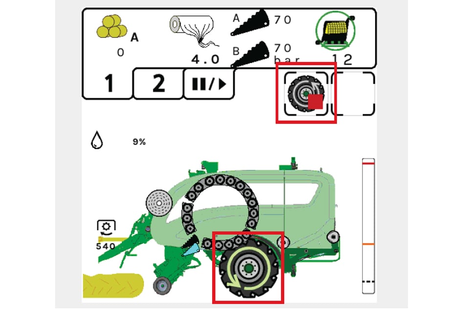 odpowiednio podczas różnych etapów cyklu belowania, automatycznie dopasowując się do prędkości ciągnika, i automatycznie włącza/wyłącza się podczas pracy na zboczach. |
