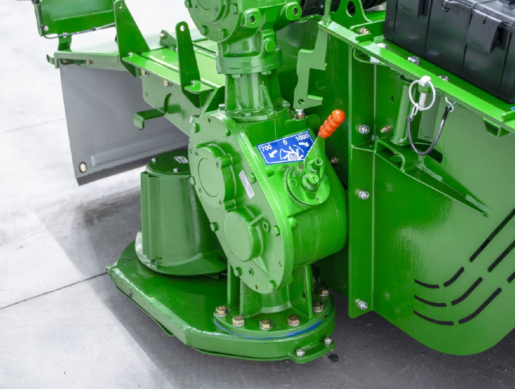 The mowing discs are specifically designed to maximise crop flow. All mowing discs are equipped with two blades that are angled to ensure a clean cut. The blades orbit with a generous overlap to deliver an uncontaminated swath. Each mowing disc has its own individual protective safety mechanism, if a collision occurs, the mechanism will shear in order to protect the drive.